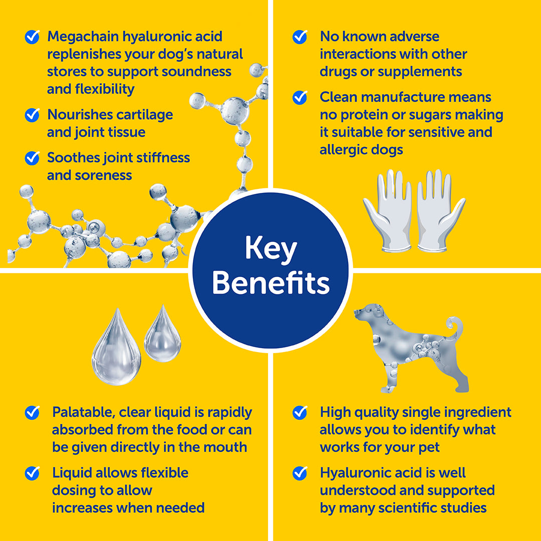 Hyaluronic acid is a remarkably unreactive molecule and can be well tolerated by all dogs and given in addition to other medicines or supplements.